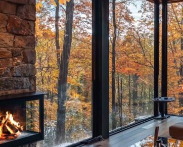 Stone fireplace, leather seating, and floor-to-ceiling windows framing a breatht… July 1, 2025 Tiny Houses